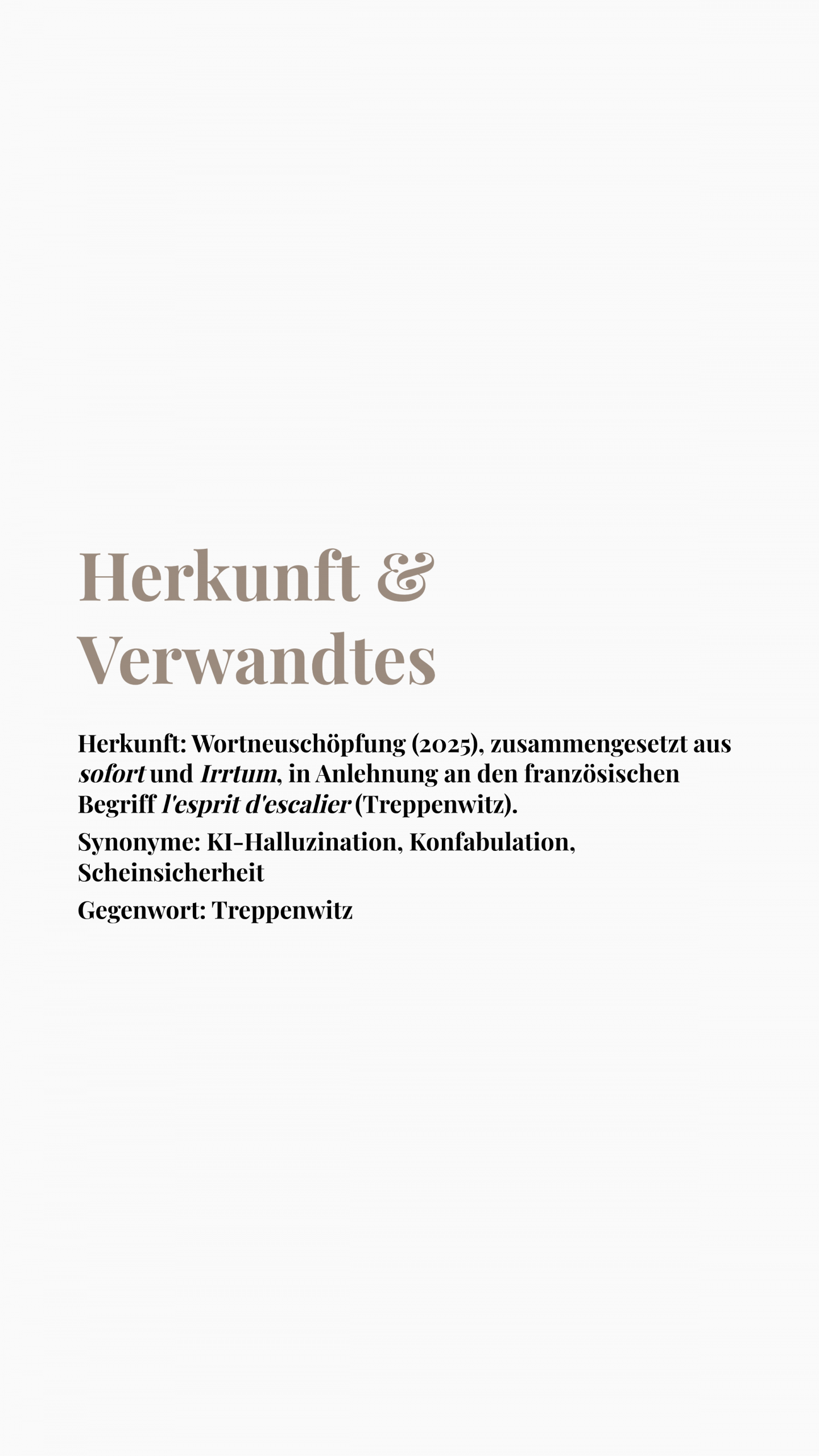 Das Wort habe ich gerade erfunden (zumindest finde ich nichts was auf dieses Wort hindeutet, außer mein Gedankengang dazu, also habe ich es erfunden), weil mir einfach kein existierender Begriff einfallen wollte, der dieses Phänomen treffend beschreibt. Sofort plus Irrtum. Eine dieser schönen deutschen Wortkombinationen, die die Realität auf den Punkt bringen. Simpel, oder? Die KI antwortet blitzschnell, mit absoluter Überzeugung, ohne zu zögern, und liegt dabei vollkommen daneben.