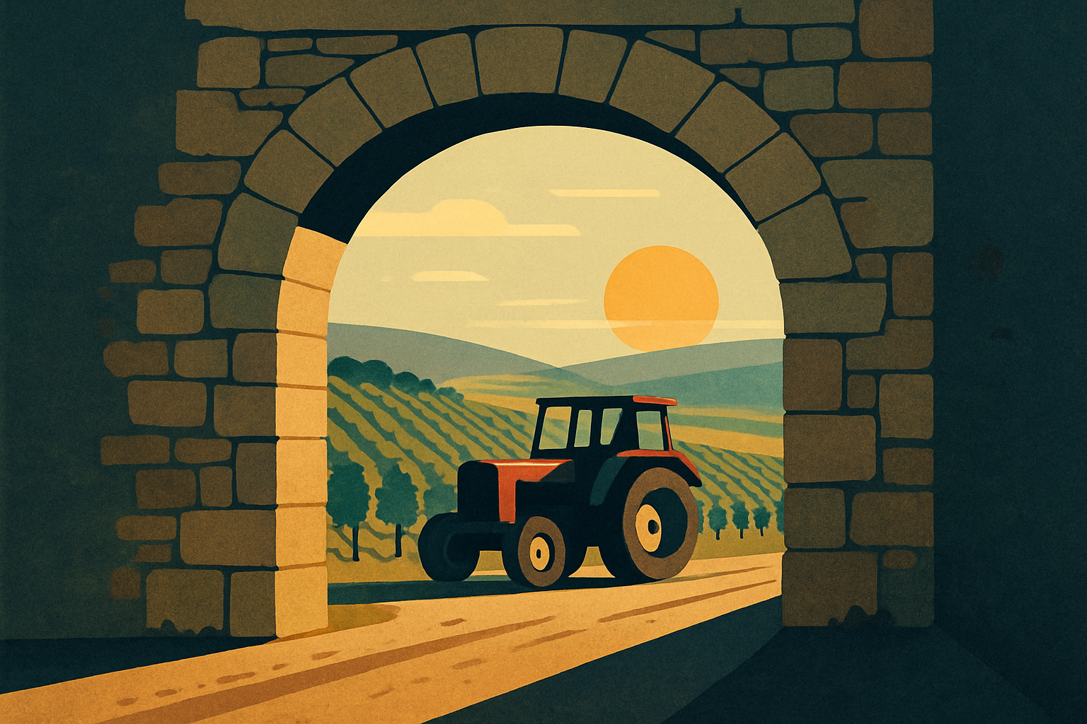Auf dem Bild ist ein rustikales Steinportal zu sehen, das wie ein Eingang zu einem Weingut oder Bauernhof wirkt. Der Torbogen besteht aus grob behauenen Natursteinen mit einem Schieferdach. Durch den Bogen hindurch sieht man einen grünen Traktor mit Anhänger, der offenbar inmitten von Weinreben oder landwirtschaftlichen Flächen steht.